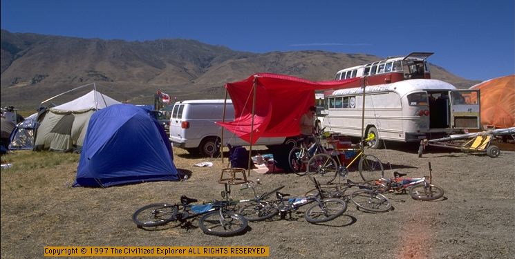 Our drugs for the week were coffee and three bottles of wine (two red and one white). Although there were drugs there, we never were overwhelmed by drugginess, there were very few people who we thought were impaired, and there were even fewer obnoxious people. Burning Man is a remarkable affair, where you are free to be yourself. We suggest a visit to our Mature Person's Guide if you have not read it before for tips on how to survive, and then browse our Burning Man Table of Contents page for information on what else our Civilized Explorer site has to offer on this wonderful event. We try to have descriptions that will alert reasonable people to the contents of the pages, but if you find we have missed something or you think we have misjudged, please feel free to let us know.